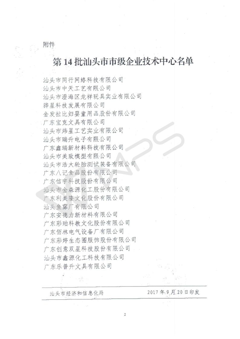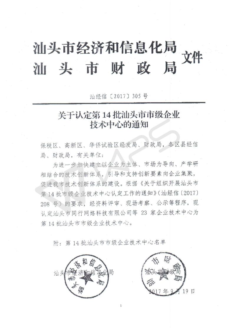 喜讯:公司通过2017年汕头市市级企业技术中心认证