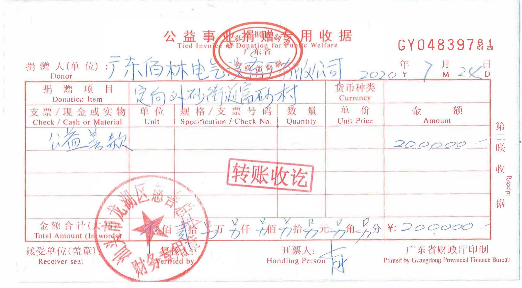 近日,我司定向捐赠公益慈善款20万元,用于开展乡村振兴项目,助力龙湖区公益慈善事业的健康发展。